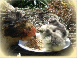 As I sat reviewing old pictures of her I heard the chirp of a newborn chicken. When I investigated, I discovered a little Pekin hen in the garden with 3 unexpected but very adorable babies. The first chicks of the season.