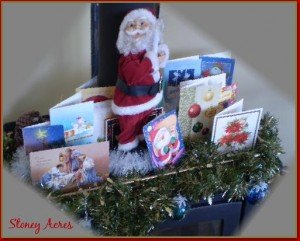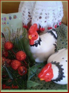 Our table centre.. usually I have a china chook sitting in this wreath 'nest' but it didnt survive last Christmas so this year I replaced with nesting Santas I found at the school gala white elephant. I love this vintage table cloth which I save just for Christmas use